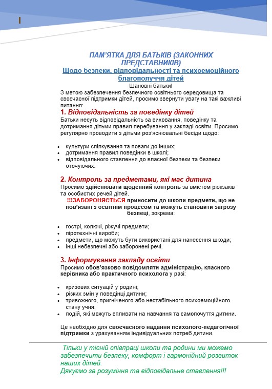 Пам'ятка для батьків для забезпечення безпечного освітнього середовища